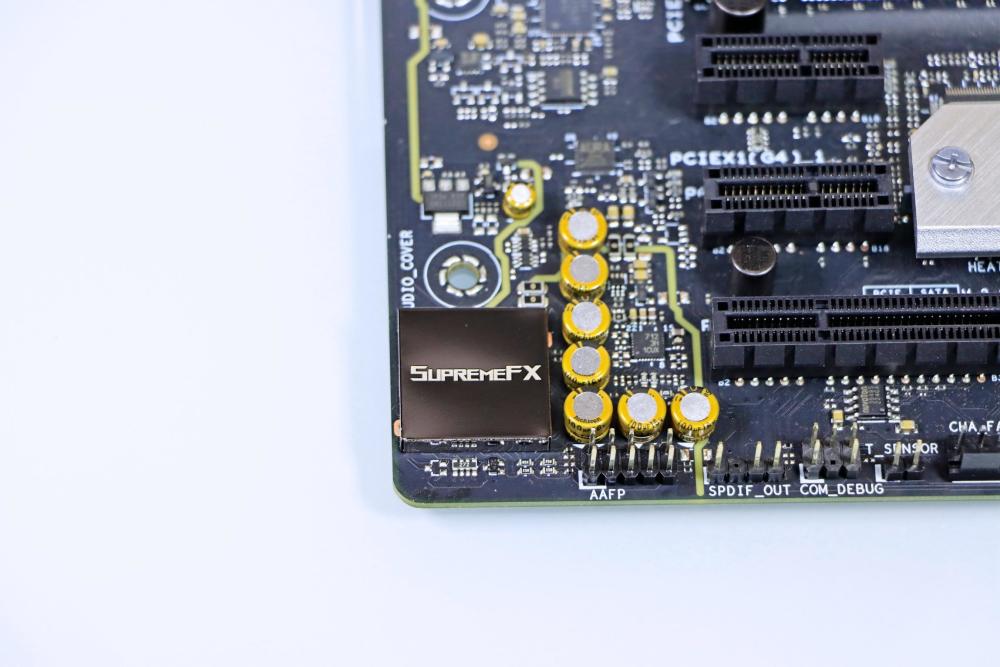 ▲ 板载集成声卡采用 SupremeFX S1220A,外面有屏蔽罩加以覆盖。它其实就是 ALC1220+ES9023P 的组合,可以实现非常出色的效果,搭配上Armoury Crate,可以开启 FPS 游戏里非常实用的第三代声波雷达,可以成为玩家的游戏利器,此外还支持多种音效,以及非常实用的双向 AI 降噪,让用户开黑时沟通交流更加顺畅。