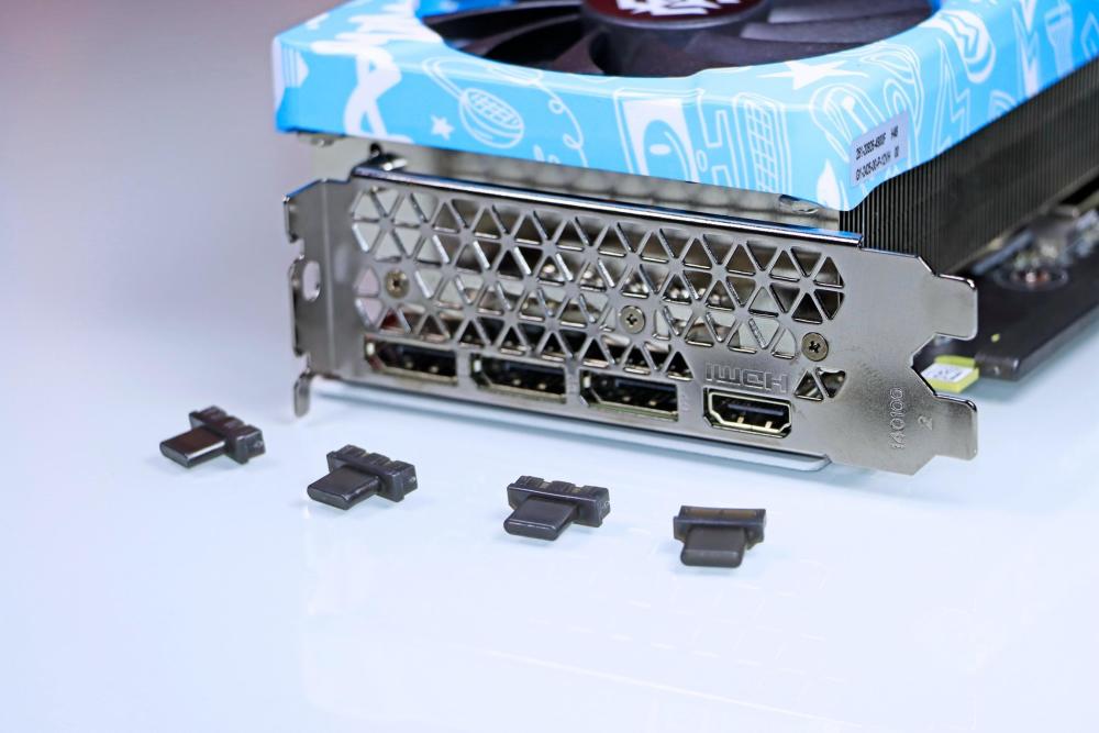 ▲ 3个 DP 1.4a 接口,1个 HDMI 2.1 接口,最大支持 8K 分辨率,每个接口都配备有防尘塞。