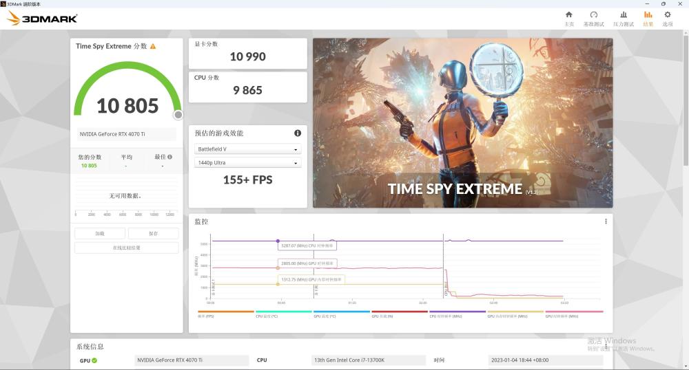 ▲ 索泰 4070Ti X-GAMING OC + 华硕 B760-G 小吹雪 D4 + 13700K 的 3Dmark Time Spy 系列性能测试。