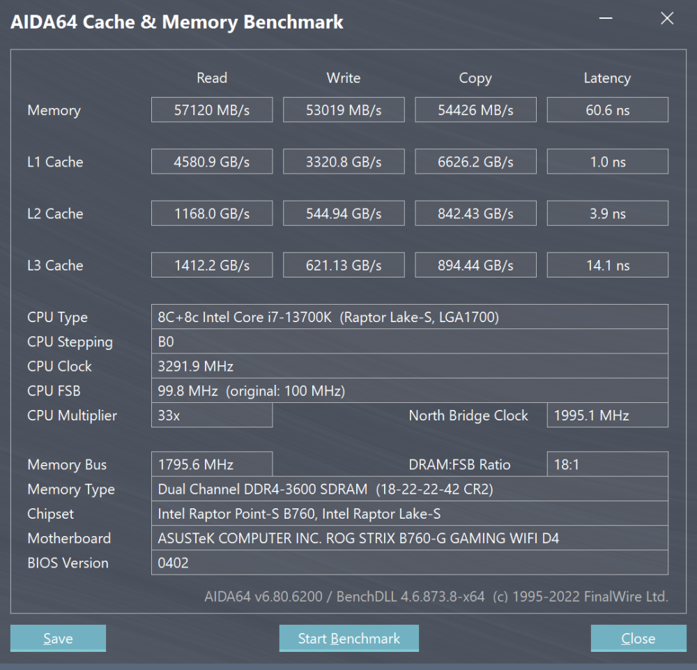 ▲ 内存与缓存性能测试同样都是金百达 刃 DDR4 3600 16G*2 这对内存,Z790-A 吹雪 D4 的内存性能会好上一丝丝,不过 B760-G 小吹雪的内存性能也十分优异,虽然两者有差距,实测这个差距必须通过数据对比才能表现出来,日常不怎么可感知,