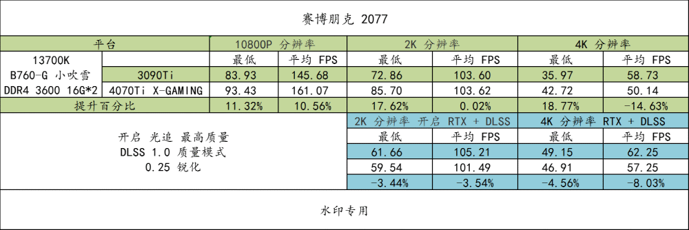 ▲ 赛博朋克2077 支持深度学习抗锯齿 DLSS 与 RTX 动态实时光线追踪,所以测试项目为传统的超级画质对比与 开启 RTX + DLSS 的项目测试对比。跟之前情况类似,4070Ti X-GAMING 在 1080P 下超越 3090Ti ,在 2K 分辨率下跟 3090Ti 表现持平,在 4K 分辨率下输给 3090Ti。
