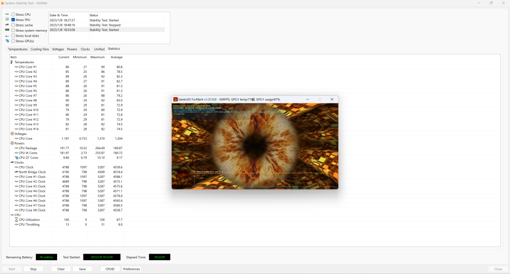 ▲ 双烤下,CPU 单钩 FPU 的温度维持在 90℃ 左右,GPU 最高温度在 72 ℃。