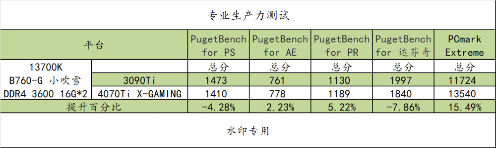 ▲ 达芬奇作为一款集调色、编辑为一体的视频编辑软件,是很多专业人士的心头好。这是 13700K + DDR4 3600 16G*2 + B760-G 小吹雪 + 4070Ti X-GAMING 整机的 Puget Systems for Davinci Resolve 测试成绩。