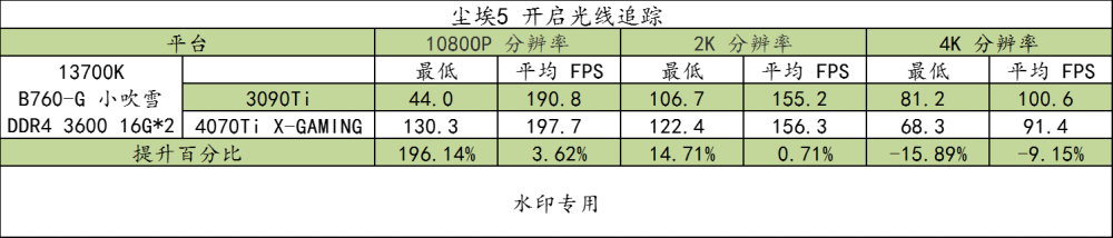 ▲ 尘埃5 游戏实测(开启光追),4070Ti X-GAMING 在 2K 分辨率下与 3090Ti 基本上不分轩轾,不过最低帧方面 4070Ti X-GAMING 在 1080P 与 2K 分辨率下表现更为出色,游戏中则表现为 4070Ti X-GAMING 表现会更加平滑、顺畅。