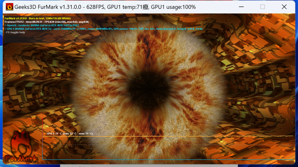 ▲ 开启 FurMark 进行了 20 + 分钟的测试可以看到最高温度在 71 ℃ 。
