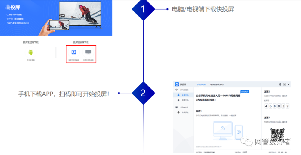 提供了3种手机投屏电脑的方式,有线数据线,无线网络,有线网络。