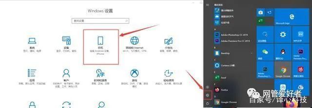 1. 然后在电脑端任务栏找到【设置】功能按钮并点击,然后选择【手机】—【转到体验共享设置】,使手机与电脑相互连接。