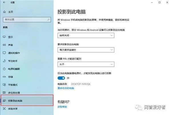 2. 最后在电脑端设置界面找到【投影到这台电脑】,根据自己的需求对投屏权限进行设置。