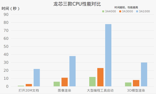除了打开Office文档,笔者还选取了另外三个典型场景,这些场景都是考验CPU能力的有效检验手段,笔者的计时数据表明,在三个典型场景(图片渲染、编程工具启动、3D模型渲染)中,龙芯3A4000都比3A3000提升一倍性能。