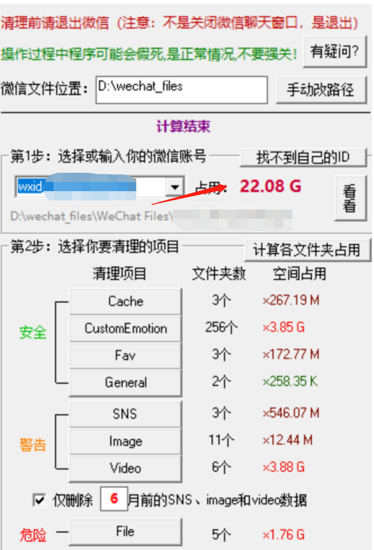 这个工具用来清理微信 PC 版磁盘占用,可以针对不同微信账号清理,分为安全、警告、危险3个类别清理。