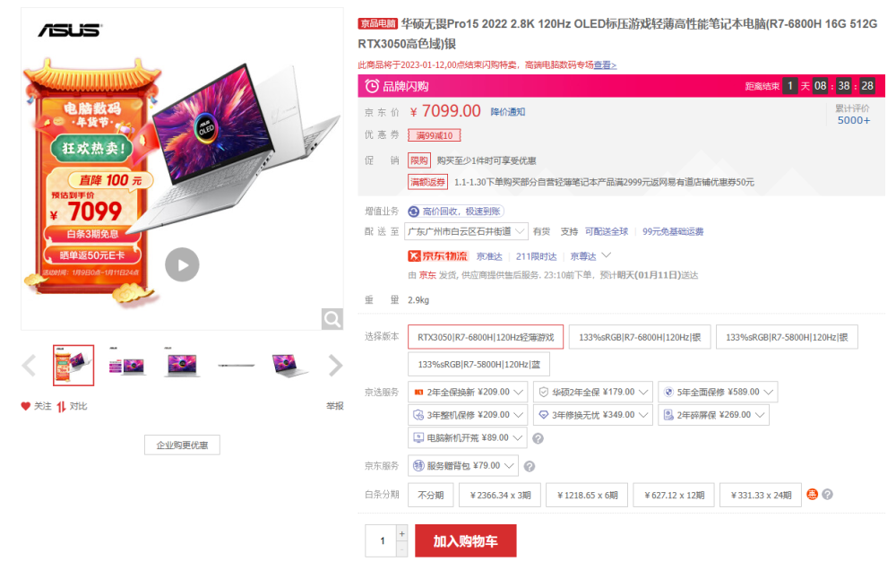 2.8K+120Hz华硕好屏、高性能、RTX3050、7099元