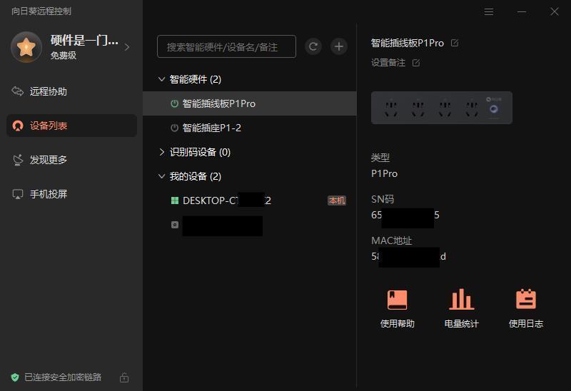 电脑端APP分为远程协助、设备列表、发现更多、手机投屏4个版块,设备列表里可以查看添加的各种设备的信息,比如P1Pro里也能查看电量统计和使用日志情况。