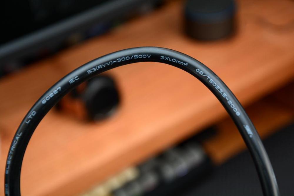插线板线长2.1米,线材上标有60227 IEC 53(RVV) 300/500V,3×1.0m㎡,单个横截面积1.0m㎡。
