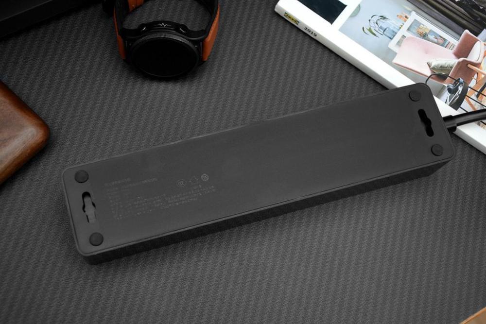 插座底部跟正面一样,表面进行磨砂处理,增加防滑性能。底部四角各有一块圆形硅胶防滑脚垫,两头各配有一个挂脚孔,方便悬挂插线板。
