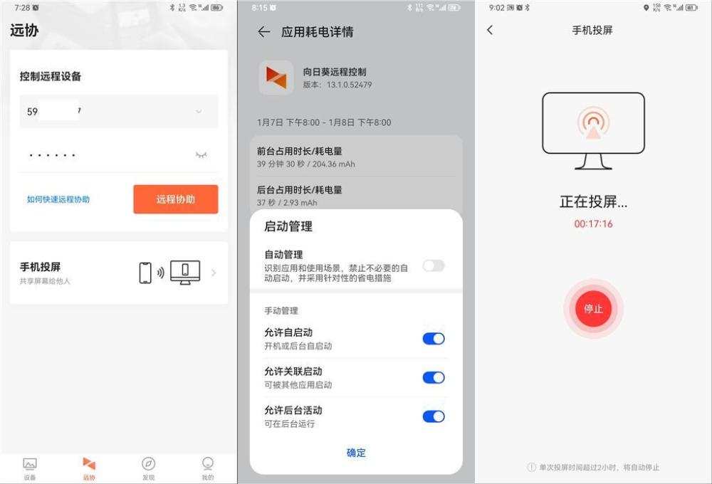 APP远协板块,有手机投屏功能,可以将手机画面实时投屏到电脑显示器上。操作步骤很简单,手机和电脑端登陆后,扫描电脑端的二维码即可投屏。投屏时有时间限制,超过2小时自动停止。如果投屏时,经常断开,教大家解决方法,打开手机应用耗电详情,找到向日葵远程控制,启动管理,关闭自动管理,打开允许自启动、允许关联启动、允许后台活动三项后,就不会出现投屏后一会儿就断开的现象。