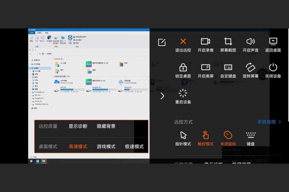 远程控制电脑是向日葵远控的一个重要功能,居家办公时经常用到,在家通过手机或平板就能自己远程打开公司电脑,查阅资料。如果需要拷贝资料的话,也可以通过QQ、微信、网盘等方式传回家里。APP功能挺多,支持录像、截屏、开启声音、锁定桌面、自定键盘、旋转屏幕、关闭设备、重启设备等功能,并且支持鼠标和键盘操作。