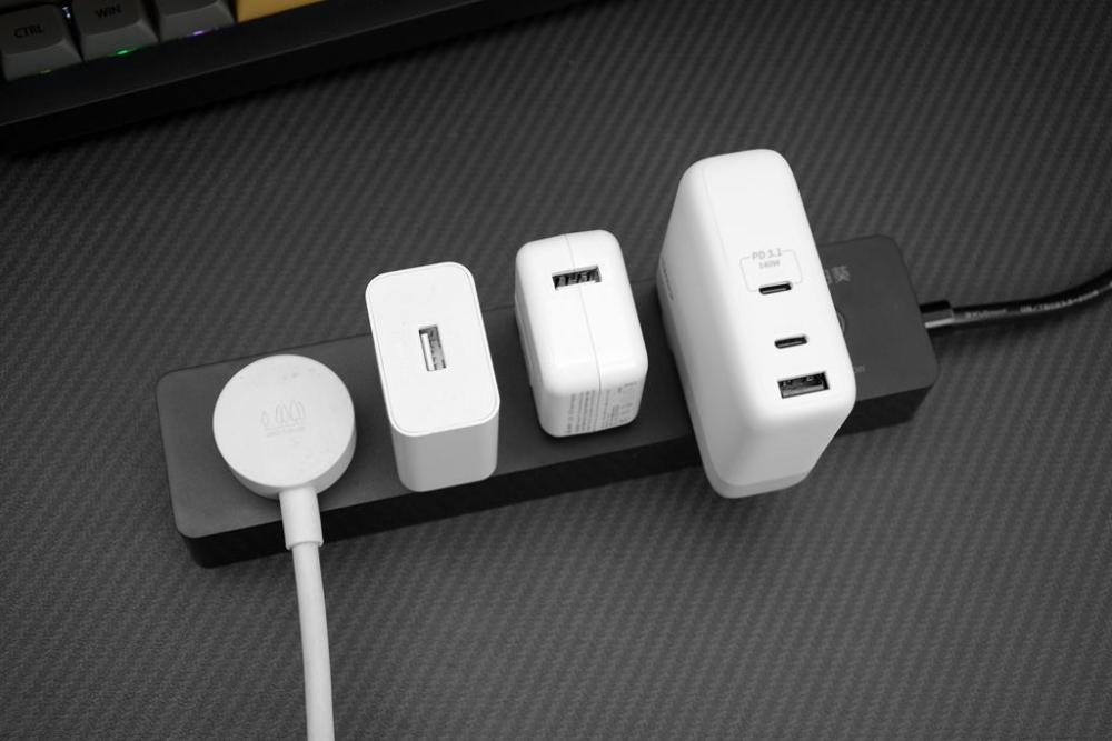 插线板的4组插孔间隔距离留的还是挺大的,我同时插上4个不同形状、大小的插头,相互之间还有很大的空隙。