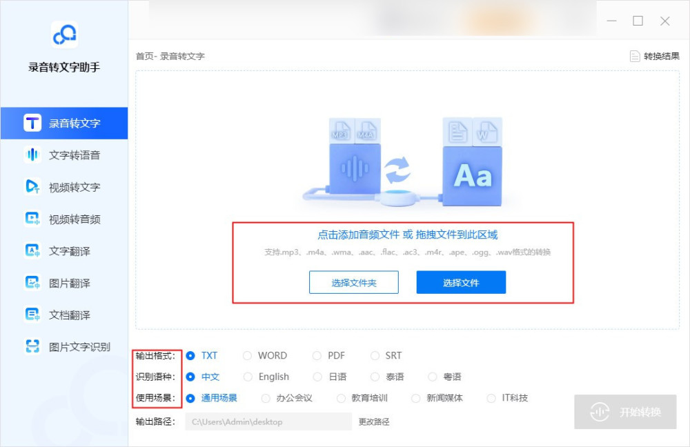 步骤二:添加需要转写的音频文件至软件中——根据录音内容选择【识别语种】——根据自己的需求选择合适的【输出格式】——点击【开始转换】——等待文字转写完成。