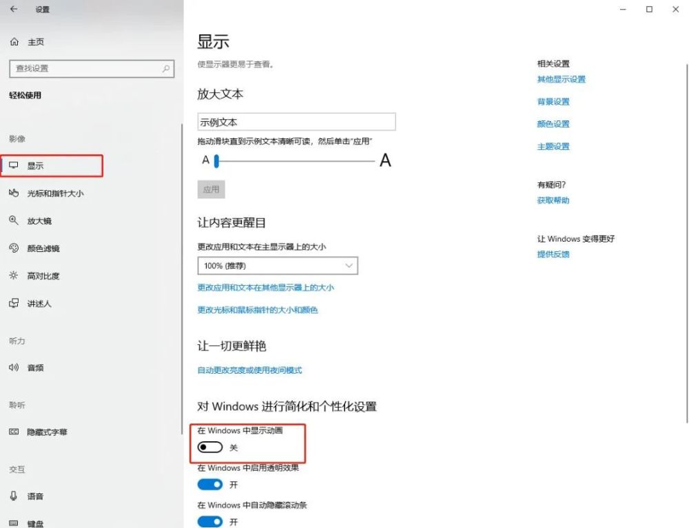 还有打开【设置】窗口,点击【轻松使用】—【显示】—【Windows中播放动画】选择关闭。
