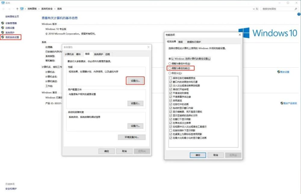 右键我的【电脑】—【选择属性】—【高级系统设置】—【高级选项中性能的设置】—选择调整为【最佳性能】点击确定保存即可。