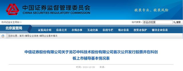根据北京证监局披露的消息,中信证券与龙芯中科于2020年12月签署《龙芯中科技术股份有限公司与中信证券股份有限公司关于首次公开发行人民币普通股(A股)并上市的辅导协议》,龙芯中科正式进入科创板申报前的最后阶段。