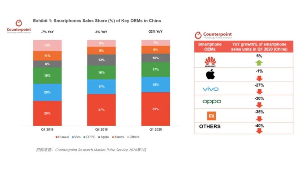 据市场调研公司 Counterpoint 最新调查显示,由于疫情影响,2020 年 Q1 中国智能手机销售同比下降 22% 。而在疫情期间,华为的市场份额上升到近 40%,是唯一一个在疫情中实现同比正增长的智能手机厂商。报告中还显示,华为智能手机的销售同比增长 6%,iPhone 的销售仅下降了 1%,vivo、OPPO 和小米则分别下滑 27%、30%、35%。