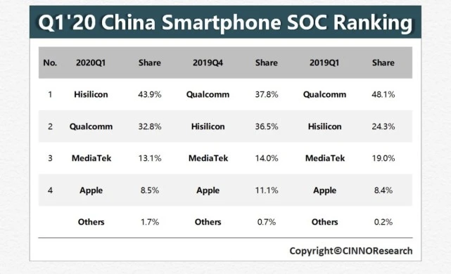调研机构 CINNO Research 的数据显示,2020 年 Q1,受疫情等因素的严重影响,中国智能手机出货量出现大幅下滑,由此导致手机处理器出货量同比锐减 44.5%。华为海思成为中国市场唯一一家 Q1 出货量未出现同比下滑的品牌,市场份额为 43.9%,首次超过高通,成为中国市场出货量最大的手机处理器品牌。高通、联发科、苹果分列二、三、四位。