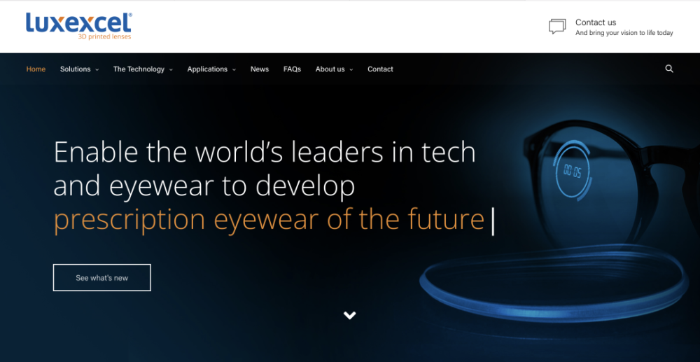 「Luxexcel」成立于2009年,使用3D打印技术制作眼镜的处方镜片。通过这项技术,客户可以自己设计心仪的眼镜,为眼镜制造商提供了更大的设计自由度。最近,该公司将重心转向智能镜片,这些镜片可以用LCD显示屏和全息膜等集成技术打印图像。