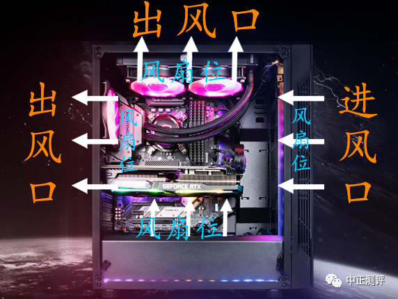 机箱前侧板为进风口,一般进风口可以安装3个12cm机箱风扇(或2个14cm风扇);后侧出风口可以安装一个12cm机箱风扇(部分机箱自带后侧风扇)。(PS:对应的水冷排就是240mm和280mm)