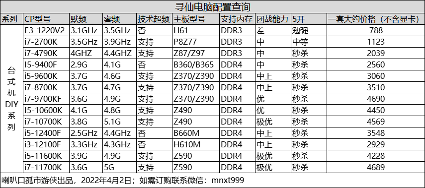 注:此配置为特殊配置,因CPU不带核显,所以必须搭配显卡才能使用。团战联盟战效果不佳,谨慎配置。