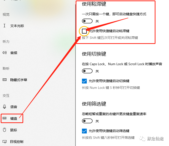 点电脑左下角:开始—设置—轻松使用—键盘—使用粘滞键—取消勾选。Shift按五次可打开或关闭粘滞键功能。有仙友在按Shift闪身五次以上的时候,电脑会弹出一个窗口。就是这个设置的原因。
