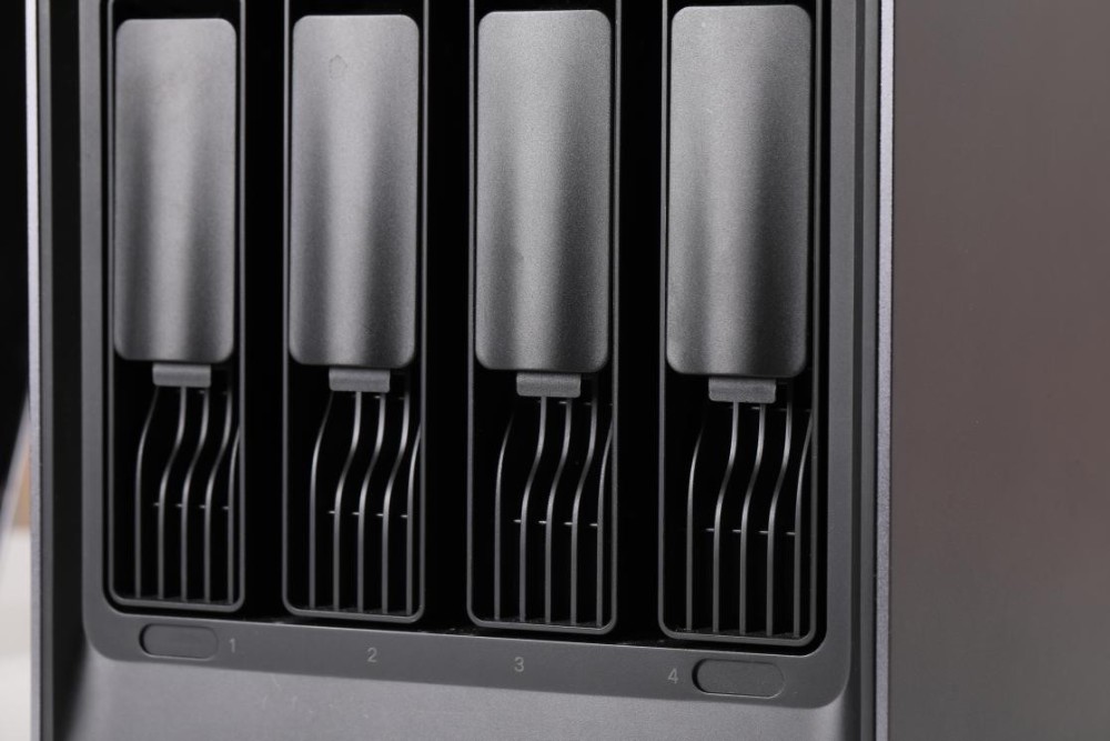 其次,在硬盘的安装和配对方法也依然简单。朋友这次借了我两块酷狼 4T 3.5 英寸硬盘,而 DX4600 这次提供了四个 3.5 英寸硬盘插槽,打开磁吸防尘盖,抽出硬盘托盘,装上硬盘,放回 NAS 即可。像我这种小白用户按着说明书一次就安装成功了,学习成本几乎为零,很友好~