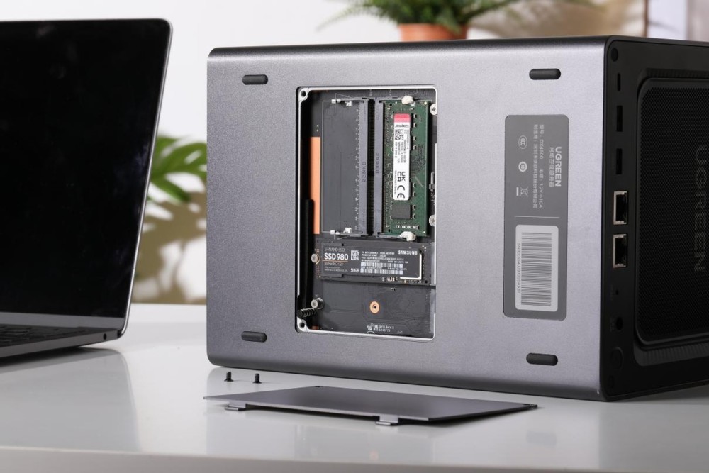 不过需要注意的是,内存条和 M.2 规格硬盘的扩容位置在 NAS 的底部,需要借助螺丝刀将盖板打开才能扩容。