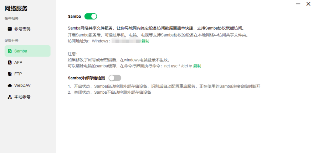 第二步,我还需在绿联云 APP 上的“网络服务”中设置好账号与密码,同时打开 Samba 服务,接着在“我的电脑”的地址输入框键入 Samba 服务的访问地址即可。