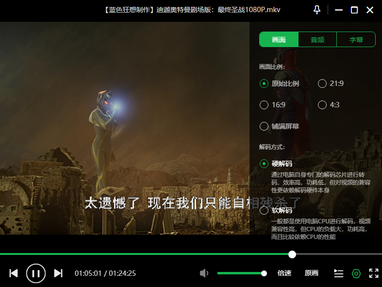 如果影片资源本身自带多个音轨和字幕,还可以在播放器中自行选择想要的版本,如果是用电脑端的绿联云自带播放器打开的话,还可以导入本地字幕,关键是随意拖动进度条也不会卡顿,拖到哪就到哪播放,和直接下载到手机本地的观看体验基本一致。