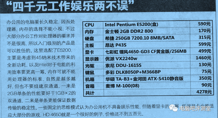 45nm制造工艺的奔腾双核E5200(2.50GHz/2MB L2/800MHz FSB)曾是2008年~2009年间追求实惠消费者的主流之选,地位有些类似于今天的i3-12100F,可以满足办公以及主流游戏的运行需求。这套4000余元的配置单出现在2008年11月的《电脑爱好者》杂志上,其中显示器、外设也占用了一部分预算。