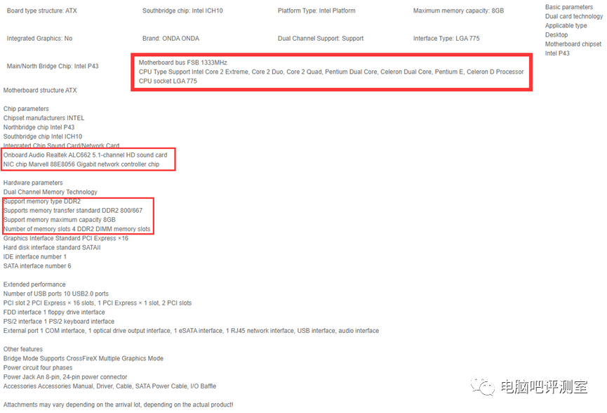 通过主板官网、中关村在线、太平洋电脑网等网站我们都可以查到主板的支持信息以及集成的各项功能。但还是因为配置单中选择了15年前的昂达主板,支持信息很难在官网找到,就可以通过第三方网站进行查询。通过查询可以知道,这张主板最高支持FSB前端总线频率为1333MHz,也就是说可以发挥Q8200、Q9300、Q9400的基本性能。