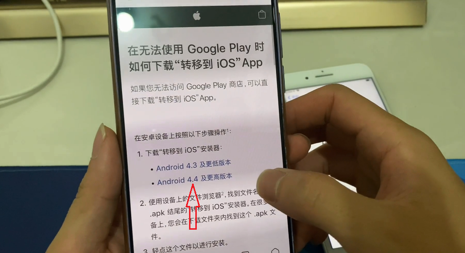 在安卓手机上直接手动输入提醒里的网站地址,点击下载“转移到iOS”,选择【Android 4.4及更高版本】,就可以下载安装完成了。