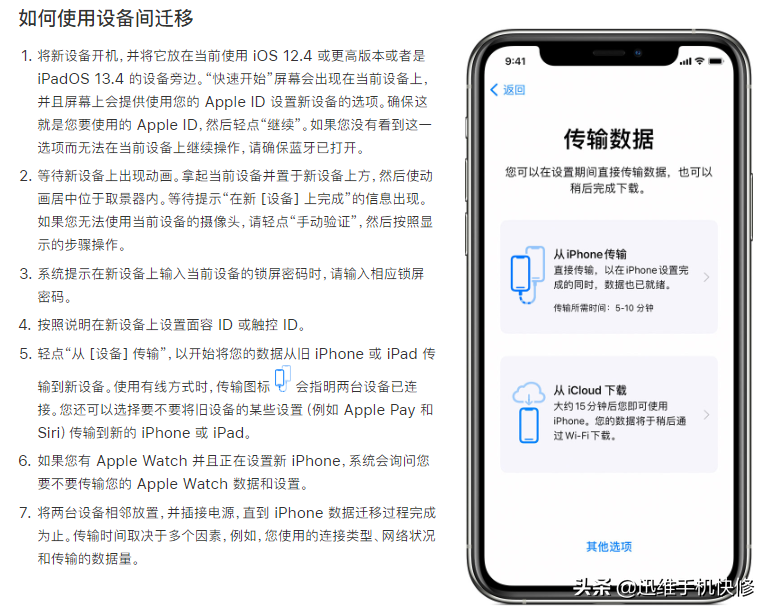 用苹果手机自带的传输功能,当新的iPhone靠近旧的iPhone就能通过无线的方式传送数据。这种传输方式花费时间有一些长,但比iCloud或iTunes传输快很多。