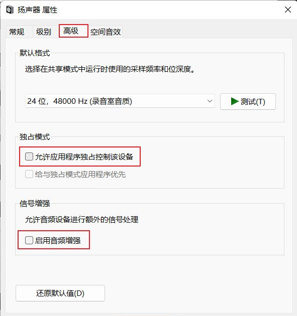 4、扬声器 属性窗口,【高级】选项卡下,取消勾选独占模式下的【允许应用程序独占控制该设备】和信号增强下的【启用音频增强】,确定保存后,再尝试进行游戏,看是否解决问题。