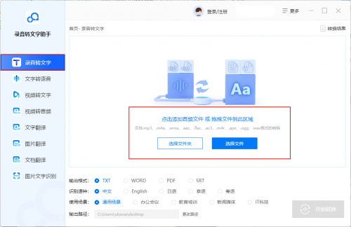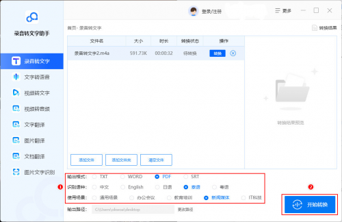步骤二:确定需要转化语音的语种,并根据你的使用需求选择“输出格式”和“使用场景”,然后点击“开始转换”。