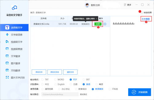 步骤三:转换完毕你可以选择直接“打开”查看转换结果,也可以在软件内对其进行“文本编辑”,编辑完毕会重新生成一个文本,方便你后续进行校对。