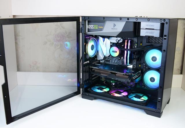 机箱的一键开窗设计也是业内少有的,无论装机,还是日常使用都很方便。这款机箱就像一个大鱼缸,从外面看就是一个艺术品,这款机箱的风道设计有点意思,由于机箱前面是钢化玻璃,所以机箱无法采用前进风设计,而是采用了底部进风,然后通过水冷向右侧出风,还有一部分从机箱后面出风,也是一种比较不错的风道形式。为了整体效果,搭配360水冷比较好看,机箱还支持显卡竖装,来满足一些竖装显卡用户的需求,不过并没有配置竖装显卡的转接线,希望后续可以考虑加配。