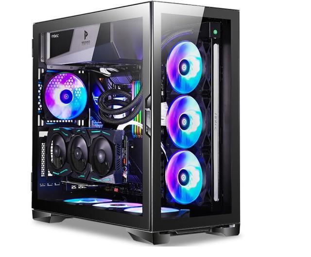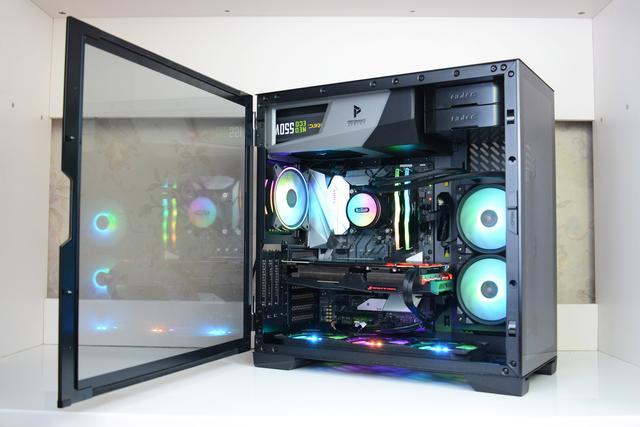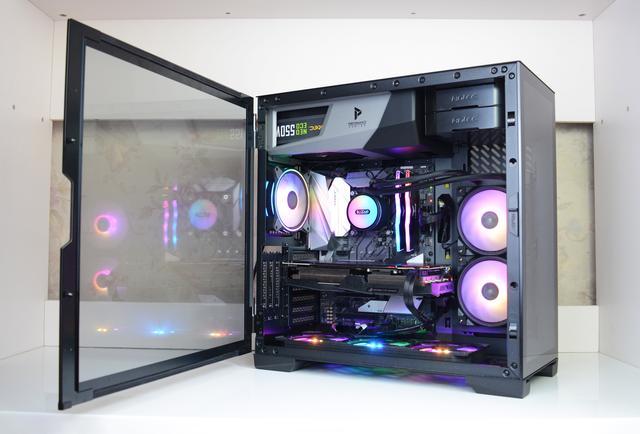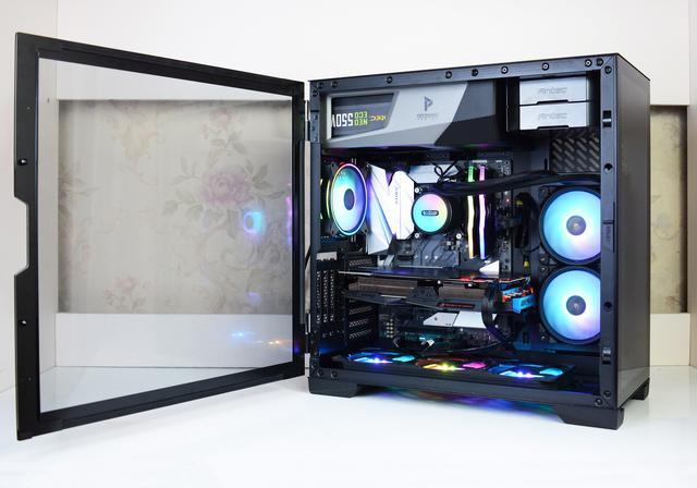 √ 优点:用料、做工不错,双侧透机箱尽显光污染效果,兼容性强,支持E-ATX主板,支持显卡竖装,还标配了显卡支架,水冷风扇正面对用户,可以从侧面看全光污染效果;