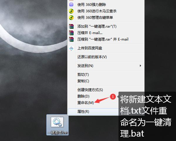 第三步,右击保存好代码的新建文本文档.txt文件,选择重命名,将文件名改为一键清理.bat文件,注意,这里的文件名后缀一定要改成.bat,然后回车即可。