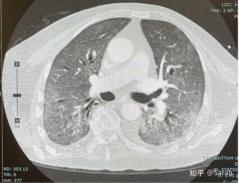 图4:疫情早期的新冠ICU场景逼到各医院都没办法了。后来,从我们医院开始,每天交接班的第一件事就是先组织一个「俯卧小组」,八九位护士一起,一个人护住患者的头,其他人一起来给这位患者做俯卧,使用各种楔状海绵在体位两侧保护皮肤受压区,现在,哪个医院也不用旋转床了,想借旋转床发财的人竹篮打水一场空。回到病例,突然缺氧患者必须要做CTPA,排除肺栓塞。栓塞倒是没有,可现在的肺野影像是这样的:(图5)