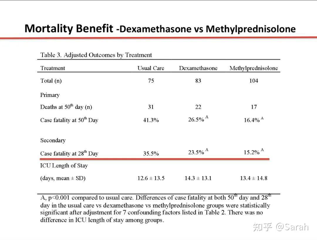 图1:COVID-19 CT影像血检查,D-二聚体3.66(正常值小于1),纤维蛋白原244,转铁蛋白1711(新冠中转铁蛋白作为一个炎性因子的指标,而不一定真的代表铁浓度)。患者其他的指标也都很高、高于正常值几倍。心肌酶0.237,偏高,我们认为这是缺氧导致的,并没做什么干预(大家记住这个数值,稍后分析病例下一步时会用到)。白细胞4.58,血小板19,血红蛋白7.5,这是不是因为新冠的影响呢?通常情况下,我们需要考虑是不是新冠影响了骨髓,但这位患者是一位白血病患者、骨髓移植术后患者,他的骨髓还没有完全达到正常人的水平,基线的血小板就在40以下,血红蛋白一直在8克左右。真正和新冠比较有特异性关系的是「淋巴细胞比例偏低」,武汉疫情时,各种数据就提出,淋巴细胞偏低对判断预后有意义。另外,患者有轻微的转氨酶增高,乳酸5.3,有点升高,这纯粹是因为缺氧了。做治疗决定时要保持基本概念清楚。这位患者显然是属于危重情况,所以才收进医院,收住ICU的。此时,治疗的主要目标必须瞄准抑制炎性反应,用地塞米松或甲强龙。指南上说,可以用瑞德西韦,但一定要在免疫抑制的基础上才能用。新出来的还有两个免疫调节药可以可以考虑,JAK抑制剂和白介素6抑制剂。指南推荐危重症患者用地塞米松可以加用JAK抑制剂,或是白介素6抑制剂。因为这两个抑制剂价格昂贵、供应量偏小。如果无法获得,就单纯用地塞米松。这是指南特别强调的,而不能反过来,不能不用地塞米松而只有这两个抑制剂。实际上地塞米松完全可以达到这两个药的作用,费用还要更加便宜。指南上还说,可以在免疫调节基础上可以加用瑞德西韦,因为瑞德西韦是针对病毒的抗病毒药,一定要在患者存在高危险因子时考虑使用,而且不要单独使用。现在我们都是循证医学,clinical trial的结果是什么就是什么,没有回旋余地。实际个人经验里瑞德西韦疗效微乎其微。还有问题需要讨论,这位患者的D-二聚体比正常值高了差不多4倍,要不要用肝素呢?新冠抗凝的观念确实明显有变化。在疫情初期时,基本所有指南都是依据D-二聚体的浓度来决定肝素抗凝到什么程度,如果D-二聚体已经4倍高于正常值,当时推荐全剂量抗凝。现在不做推荐了,只推荐预防剂量的肝素。如果患者有其他胃肠道出血等等禁忌症的话则禁用,效果和害处的「益害比」已经有所变化。甚至指南专门提到,如果患者转入ICU前已经使用了治疗剂量肝素,就要考虑停掉它,除非有深静脉血栓等等指征。这位患者收到ICU后,我们使用的是甲强龙、高流量鼻管吸氧、俯卧位、瑞德西韦。俯卧位是一直保持到现在的、认为对患者有好处的治疗手段。四、详解激素应用我们细致讨论下激素的选择。激素是个老药,尽管在新冠中启为新用,依据仍然是激素的药理。因此,给患者用激素时,不应该死板教条,自己首先要很清楚激素的药理作用、生理作用。我们在此把激素的基础知识先过一遍。静脉点滴可用的激素有三种,氢化可的松、甲强龙、地塞米松。作为药物使用和作为激素使用的区别在哪里?如果它作为激素使用,作用是通过类固醇,和受体结合后再进入细胞核,进而影响细胞的代谢。而一旦作为药物使用,就比生理浓度高出几十倍,这时所有的受体都已经被饱和了。因此,虽然仍然称为「激素」,医师应该非常清楚,其药理是通过这些分子直接和细胞膜结合起到的药理作用,和「激素」作用已经基本无关。三个ICU常用激素之间有所区别。首先,药物的强度不一样,按照大致的比例换算起来,以氢化可的松作为1的话,地塞米松是25倍,甲强龙是5倍;如果需要用100毫克的氢化可的松,那地塞米松应该才用4毫克、甲强龙用20毫克左右。还有一点更重要、和我们稍后的讨论非常有关的就是这些激素在药理「半衰期」。虽然生物半衰期可能很长,在危重情况的疗效要保持持续的血清浓度,使用氢化可的松需要一天三次、甲强龙一天三次、而地塞米松应该一天四次。除了这些区别,各自的首选适应症也有不同。如果你是一位内分泌科大夫,患者出现肾上腺皮质功能不全、血压很低,首选用什么药?大家最先想到的肯定都是氢化可的松。第二,如果患者出现创伤性的损伤,如脑损伤造成脑水肿、如耳鼻喉科的气管操作后的声门水肿。这时水肿虽然要属于炎症表现,但这些炎症不主要是细胞因子引起的,而是因为局部机械性损伤。对于神经外科医生而言,处理脑水肿该用哪个激素?大概人人都会选择用地塞米松。对于耳鼻喉科医生而言,患者声门水肿时,大家往往也会选择地塞米松。为什么会这样?因为这三种激素和细胞膜结合的亲密度不一样,所以造成的细胞反应有区别。而我们作为呼吸科的医生,处理的肺内炎症反应多半都是细胞因子引起的,如过敏性肺炎、如NSIP,如肺移植急性排异、如狼疮肺炎,如类结节病,这些情况下要用激素,应该选什么呢?呼吸的教科书上一律指向甲强龙,而不是氢化可的松和地塞米松。为什么要做这种讨论?现在面对新冠时该怎样选择激素用药?我们自己做过试验。激素的争论从SARS时就开始,却惜无定论。我曾经强力建议逆行武汉的同事一定抓紧测试激素效果,甚至写过专文,却仍然未得实施。所以我一接管ICU第一件事就开始测试激素效果。本来是有目的的想分组做试验,后来一看没法弄。一来,没有时间提交伦理批准进行正式试验。二来没有别人相信「激素对新