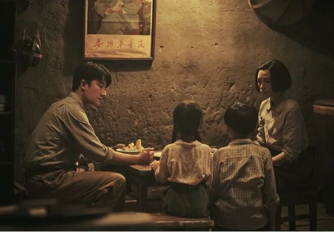 当下的新主流电影摆脱了以往以“家庭”为中心的向内/回归、向外/逃离叙事机制的单一性,跳出了个人—集体/家庭—国族对立的情理冲突模式,在两极之间极力进行持续性的空白填充与裂隙缝合,让“英雄”回到家庭中去,赋予他们真实、完整的人格与人性;也在家国并行的前进旅途中为道德伦理正 名。在《我和我的祖国》、《我和我的父辈》(2021)、《长津湖》(2021)等新主流电影中,它们对于革命 英雄以及平凡英雄的认知蜕化于各自小家庭的成长,并逐渐将两者融为一体,强调家庭伦理于英雄成长过程中所发挥的不可忽视的作用。以《我和我的父辈》为例,章子怡导演的篇章《诗》,并没有以宏大的视角讲述航天先辈无名奉献的故事,而是将其内核换化成家庭小事,以儿子不断“找爸爸”的视角呈现,从“听别人说爸爸会被炸死而打架——发现爸爸再未回过家——暴雨夜质问妈妈‘我爸是不是死了’”的线索推进,一层一层剥离出其作为父亲朋友遗孤的真实身份:“我爸和我以前的爸爸都死了”。倒叙手法的使用让观众在剧情的发展过程中不断进行自我猜测,却又在最后揭开谜底时被牺牲、奉献所包裹的至真情感深深震撼。以儿子心碎寻父之切,描摹出家庭背后更加宏伟的国家梦想,无人能够不为之动容。但影片并未止步于此,而是将家庭信念与国家未来相连接,以子女们最终实现人生梦想的当下时态接续了革命岁月最炽热的信仰光辉。影片中每个人都是时代与家庭的“双面英雄”,父母既是 国家层面中隐姓埋名、奉献自身的革命建设者,亦是温暖家庭的守护者与领航员;子女既是时代光荣的航天英雄,也是坚强乐观、历经苦难的少年英雄,其家庭内部的迸裂与重生,成为塑造时代英雄的血液与力量,供其韧性生长(图3)。又如《 我和我的家乡》中《神笔马亮》篇,将马亮放置于婚姻伦理与乡村建设的博弈中,通过乌托邦式想象情景的搭建 解构对妻子的善意欺骗,并最终于伦理维度的调和与社会层面的双重成长实现两全其美的欢喜结局;再如《长津湖》以“伍千里”“伍万里”兄弟俩的亲缘情感作为叙事主线之一,进而将狭义的兄弟情推而广之到整个七连,赋予家庭更宏大的涵义,于此,英雄的出世需要历经残酷战争的磨炼,并与家庭内部的情理成长相得益彰(图4)。由此可见,在以家庭为原点的创作场域中,新主流电影缝合着伦理亲 情与家国梦想交织的空白点,以家国同构的叙事形态在影片内部散射性扩展,实现了对主流电影内向性和外向性的统合作用。并通过人际、家庭、伦理等视角的呈现,拉近了观众与电影的距离,对影片所构建的集体记忆与潜在政治意识产生认同心理,达到其宣扬社会价值观的内在教化作用。