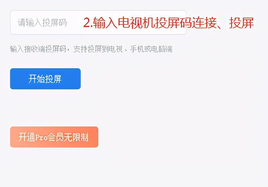 输入电视机投屏码连接、投屏:在页面右边,还有一个窗口,通过投屏码来投屏。在窗口上方的方框内,输入电视机的投屏码,点击【开始投屏】即可。
