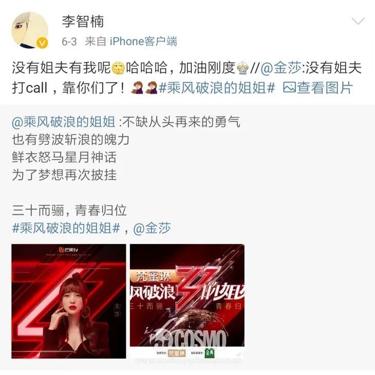 姐姐官宣时,金莎发言“没有姐夫打CALL,靠你们了!”李智楠捡起许久未更新的微博,转发“没有姐夫有我呢,加油!”
